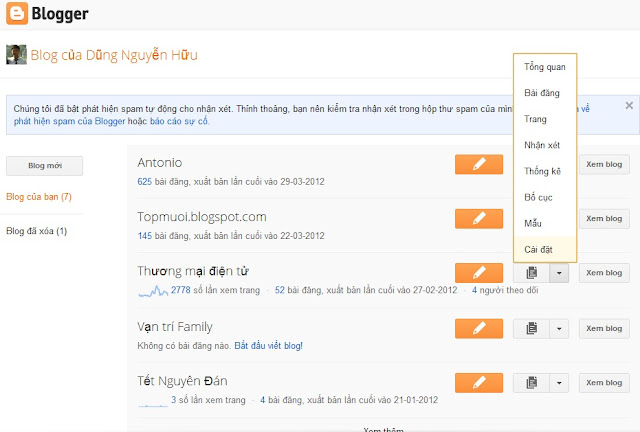 Bước 1: Đăng nhập quản trị blog và click "Cài Đặt".